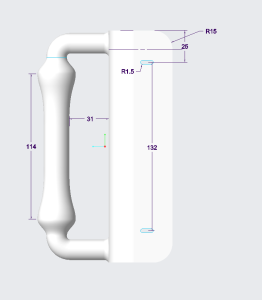 The design started from sketching different concepts for the handle shape. Special focus was placed on ensuring that the handle would be comfortable to use. The idea was to not even attempt to replicate the original part, but rather to utilize the freedom given by 3D-printing to create a completely custom handle. Once a suitable shape was established, measurements needed to be taken from the door to establish locations for the attachment screws, as well as geometry of the attachment plate. After receiving the measurements, I started to model the handle using a CAD-software. The modelling process itself was split into two parts: The attachment plate and the handle itself. The part did not require any complex modeling techniques, and was created relatively quickly. To verify the dimensions, I sent the annotated screenshots of the model to my friend for feedback.