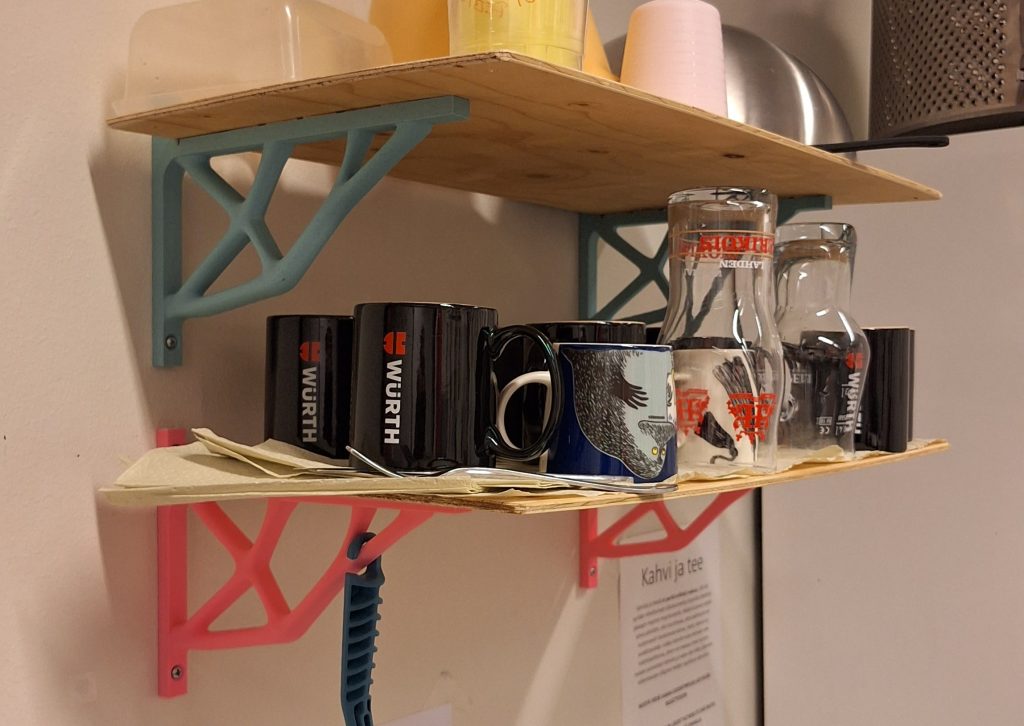 Our guild room needed a shelf to organize all of the coffee cups and some other things. We also had spare plywood available to be used as the shelf itself, so I thought that designing a custom bracket would make for an interesting project! It was also a good chance to utilize topology optimization tools and the design freedom provided by 3D-printing. I would also like to emphasize, that the purpose of this project was by no means to create the most efficient, cheap or lightweight bracket design. The goal for me was to create an interesting shape with a high degree of functionality, while keeping the need for printing supports minimal!