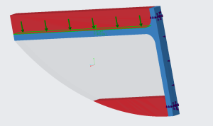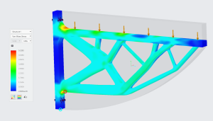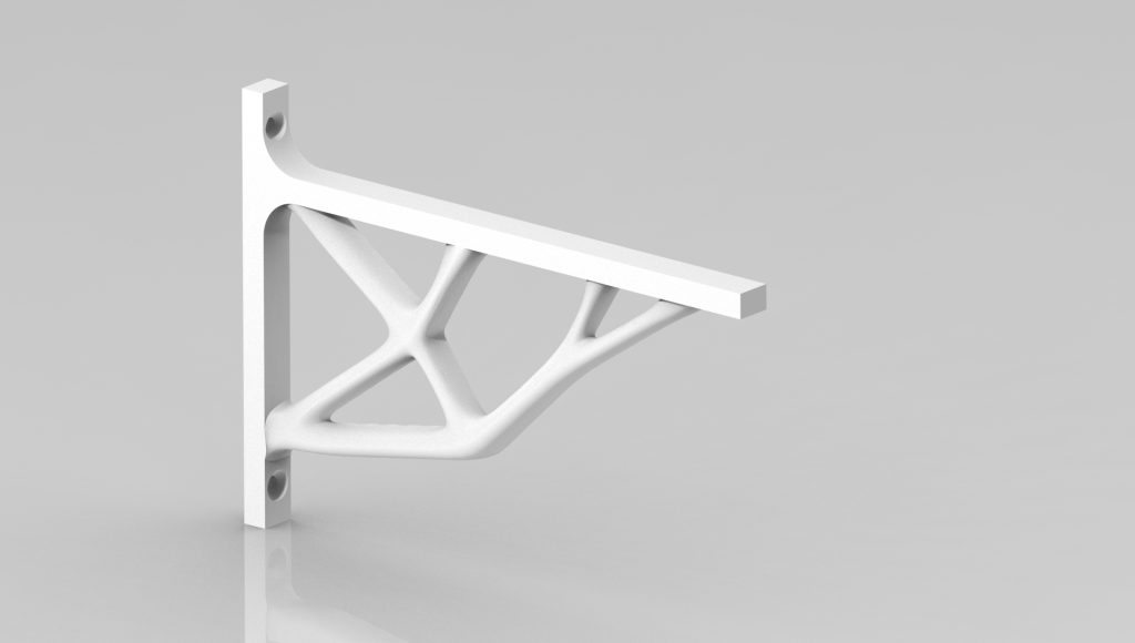 After establishing the geometries model was optimized using Creo’s “Generative Design” – extension. Design criteria was assigned to maximize stiffness while limiting the maximum volume of the final part to 40%. Displacement constraints were applied to mounting holes as well as the backside of the bracket. A force load of 400 Newtons was applied to the surface onto which the shelf will be mounted. In the spirit of “Design for Manufacturing” (DFM), a “linear extrude”- constraint was added to one side. This ensures that one of the sides will be flat, which eliminates the need for practically all support structures during the printing process.