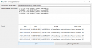 Let’s create UI. For UI we need textbox for the lecture header and multiline textbox for the teaching schedule. We take copy from the opas.peppi.utu.fi page (the header) to header field and copy teaching schedule to teaching schedule box. Also some button for sending the calendar items to Google Calendar.