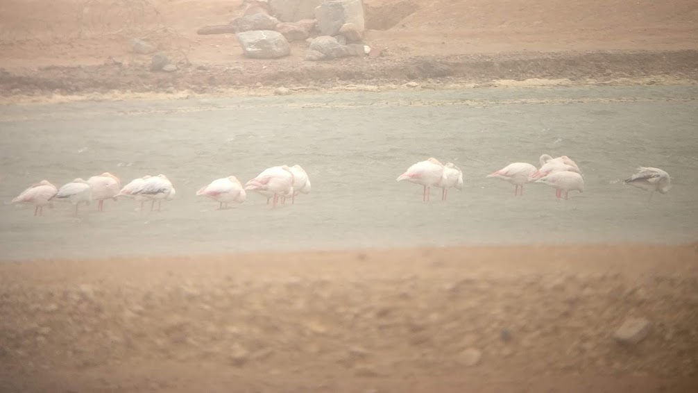 K19-altaat olivat kovin kuivat. Yhden altaan nurkassa viihtyi tosin rääkkähaikaroita. Yli muutti viisi spinolettaa ja pari feldegg-väiskiä. Auringonlaskun jälkeen flamingoparvi kävi altaalla pyörähtämässä, vekkulin näköisiä.